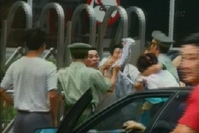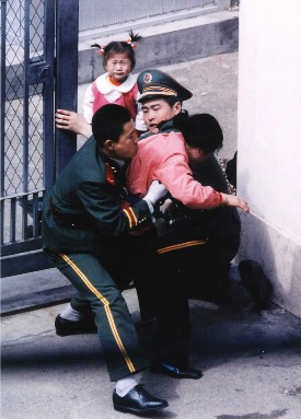Two-year-old Han-mi looks on in agony as her mother is wrestled to the ground by Chinese guards at the Japanese Consulate in Shenyang, China.