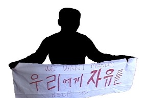 A North Korean refugee, part of a group known as the "MoFA Seven," holds up a banner that reads "We Want Freedom, Help Us." The MoFA Seven attempted to apply for asylum to the Chinese Ministry of Foreign Affairs ("MoFA").