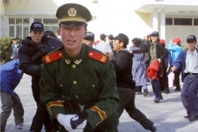A Chinese soldier tries in vain to stop 25 North Korean refugees from rushing into the Spanish Embassy to obtain asylum.